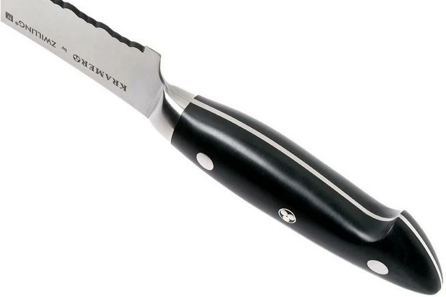The Bob Kramer by Zwilling Euro Essential bread knife impresses with its elegant and timeless design. The knife effortlessly cuts through different types of bread. Even bread that has a hard crust is no match for this knife because of the special serrations and the fine edge. This, however, doesn’t mean that you can only use this knife for bread. After all, you can also use this knife to cut cakes and pies but also hard types of fruit or vegetables.