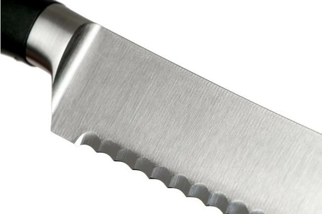 The Böker Core Professional bread knife 22 cm – BO130850 is a one-sided serrated bread knife. The serrations are relatively sharp and therefore not rounded. Sharp serrations have better cutting qualities and you will be left with less crumbs when you use a bread knife with sharp serrations. For more information. What do you need to know about serrated knives?