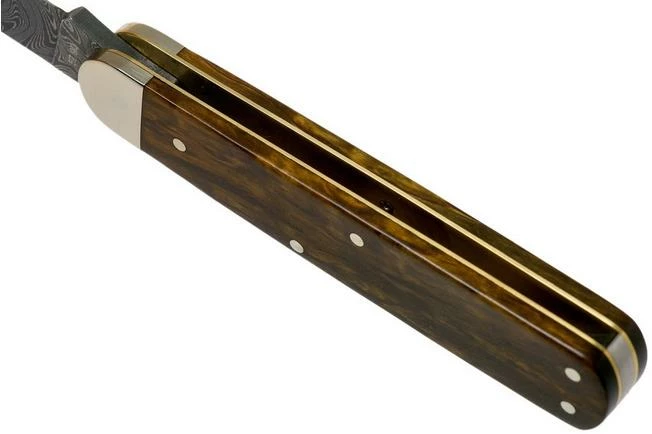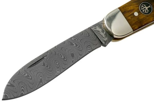 The Böker Mono Damascus Curly Birch is a classic hunting knife. A cool knife which has been a part of the Böker catalogue for years, but is now available as a special Limited Edition. You open it with two hands and it is locked by a backlock. Behind the nickel silver bolsters you will find a curly birch wood inlay. It is a type of wood enhanced with a stunning pattern. This knife is stabilized with green resin to make sure it is almost as strong as plastic.