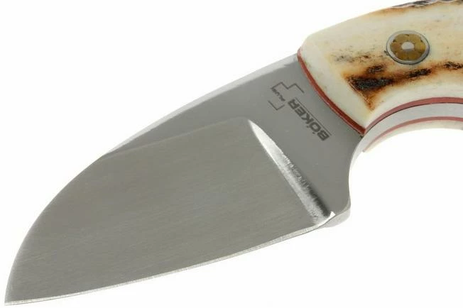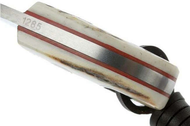 This small fixed blade knife is so compact that it is always readily available. Despite its small size, this little gem is easy to use thanks to its ingenious design, created by knifemaker, Jesper Voxnaes. The splendid stag handle scales give this knife its stylishly exclusive look. This is further enhanced by the red fibre layers beautifully crafted between the blade and the stag scales.
