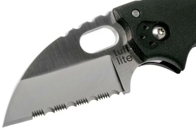 The Cold Steel Tuff Lite is an amazing pocket knife for daily use. Compact and made from materials that have proven their worth in many other knives. The Grivory of the handle can handle moisture, heat, cold and a lot of chemicals. The AUS8A steel blade has a shape that is derived from a sheepsfoot or Wharncliffe. The straight cutting surface is razor-sharp. Because the blade is left blank, it is not as tactical as many other Cold Steel knives. The serrations are great to cut through high-fibre materials.