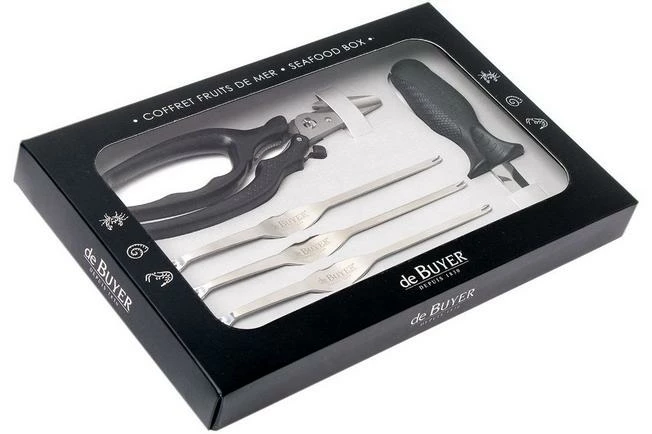 If you want to enjoy shellfish you need special tools: this DeBuyer Seafood Box has everything you need. Lobster scissors to divide the lobster, four stainless steel lobster forks to remove the best parts of the lobster and an oyster knife to open oysters.