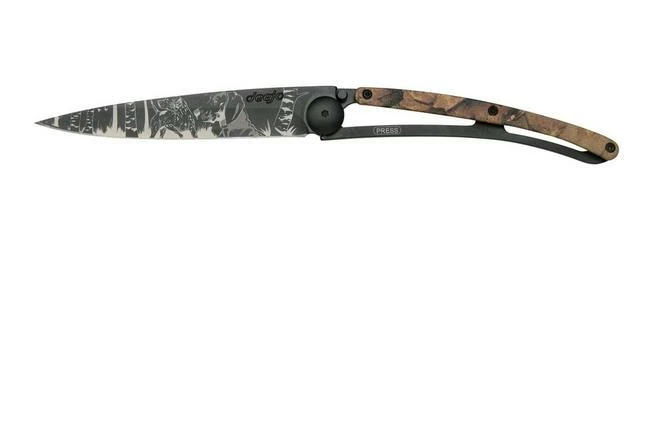 The Deejo Tattoo 37g Brown Camo Hunting Day is a part of the Deejo Tattoo collection. The name says it all: these pocket knives feature artistic tattoos on the blade. The tattoo collection clearly demonstrates how artistic Deejo is. Adding these tattoos gives each knife a newer, deeper meaning. Just like a painting, this pocket knife can be considered a work of art!