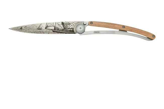 The Deejo Tattoo 37g Olive Wood Sailing is a part of the Deejo Tattoo collection. The name says it all: these pocket knives feature artistic tattoos on the blade. This pocket knife has a tattoo of a surf scene on the blade and it has an olive wood scale. The tattoo collection clearly demonstrates how artistic Deejo is. Adding these tattoos gives each knife a newer, deeper meaning. Just like a painting, this pocket knife can be considered a work of art!