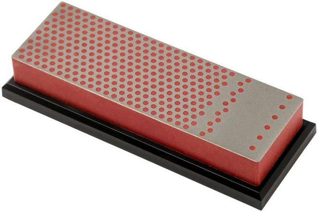 The DMT Machinist Diamond Whetstone Fine is a diamond-coated sharpening stone with which you can sharpen blunt knives and other tools. The solid and extra-high plastic base ensures that your hand has enough room as you sharpen your knife. The plastic storage box protects the sharpening surface if you don’t use the sharpening stone. Great if you work in a crowded workshop or at a full working station.