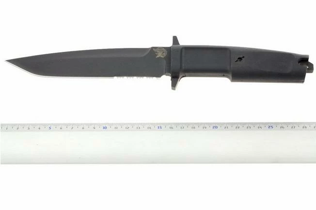 Commissioned and officially adopted in 2002 by the Ninth Rgt. Incursori “Col. Moschin”, this model is the quintessence of a pure combat knife with an asymmetric blade. Used by the Arditi, in whose footsteps the Col Moschin Regiment follows, it has been re-elaborated in a modern form, endowed with a partly plain and serrated blade, integral guards and a removable E.R.M.H. handle in Forprene. Grinding is hollow grind razor sharp. The centre of gravity is towards the end of the handle, the point especially sharp, it is light, manageable and intuitive.