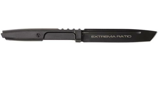 The Extrema Ratio Mamba is a slim fixed knife with a distinctive tanto shape. The Mamba is named after the famous Mamba snakes, mainly found in Africa. Just like its namesake, the Mamba is sleek and slender. And dangerous, too. The blade is made from stainless Böhler N690 steel. This steel retains its sharpness well and is also easy to sharpen. The blade is a tanto, a pointed shape that is especially effective at piercing. There is a groove in each side to save even more weight and thus improve the overall balance. The handle is made from durable Forprene plastic. It’s comfortable in hand, even after a long period of use. The blade has a sturdy tang that can be seen at the end of the handle.