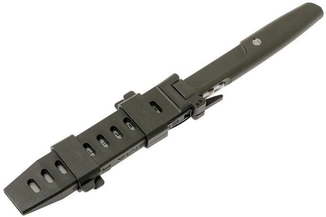 The Extrema Ratio Mamba is a smart fixed knife with a distinctive tanto shape. The Mamba is named after the famous Mamba snakes, mainly found in Africa. Just like its namesake, the Mamba is sleek and slender. And dangerous, too. The blade is made from stainless Böhler N690 steel. This steel retains its sharpness well and is also easy to sharpen. The blade is a tanto, a pointed shape that is especially effective at piercing. There is a groove in each side to save even more weight and thus improve the overall balance. The handle is made from durable Forprene plastic. It’s comfortable in hand, even after a long period of use. The blade has a sturdy tang that can be seen at the end of the handle.