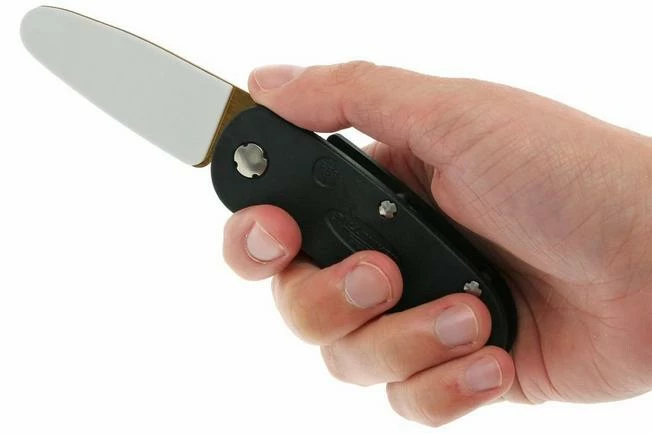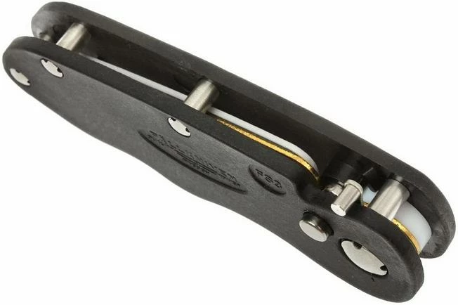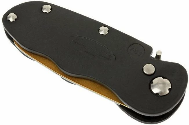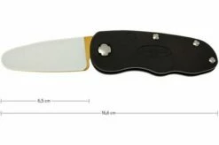 The Flipstone sharpening stone is an automatically folding sharpening stone that can be used on two sides. The dimensions could be compared to the ones of a pocket knife. The FS3 is just slightly smaller than the FS4. You can therefore always carry this sharpening stone with you. The yellow side is a diamond sharpening stone with a grit size of 25 microns. Repairing the cut is done with this side while the maximum sharpness is determined with the ceramic side of the sharpening stone. Both sharpening stones are glued together and will not come loose.