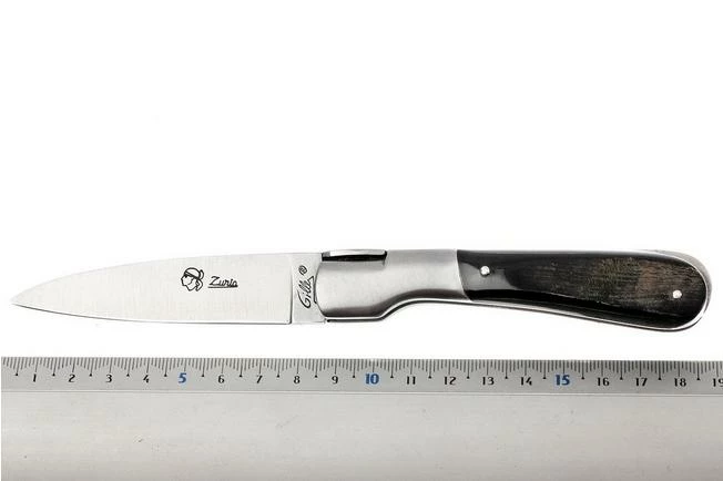 Classic French hand-made Laguiole pocket knife. Closed length: 10.5 cm. Features a 12c27 steel blade and back-lock system. Handle is made from buffalo horn bark.