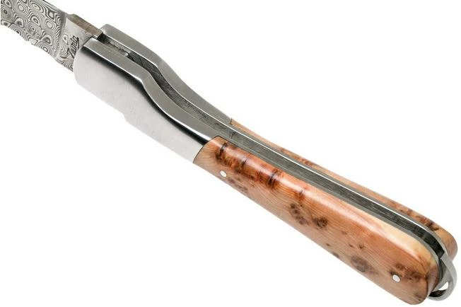 Classic French hand-made Laguiole pocket knife. Closed length: 12.3 cm. Features a damascus (rose) steel blade and back-lock system. Handle is made from juniper wood.