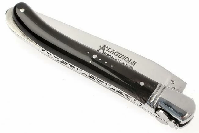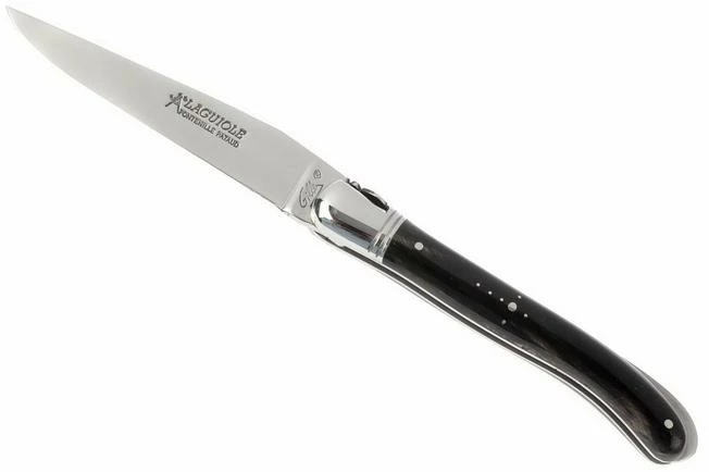 Classic French handcrafted Laguiole pocket knife. Folded length: 12 cm. Exclusive design with blade manufactured from 12c27 steel. Equipped with handy locking mechanism. Handle with casing made of black buffalo horn, decorated with the traditional metal cross design. The handle on each knife is unique.
