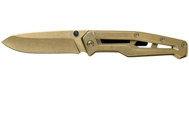 The Gerber Paralite Champagne 30-001345 is a cool pocket knife with a luxurious look and feel. The droppoint blade is made from 5Cr13-steel. You can open the knife with one hand with the thumb studs on the blade. When opened the knife is locked by a framelock.