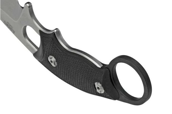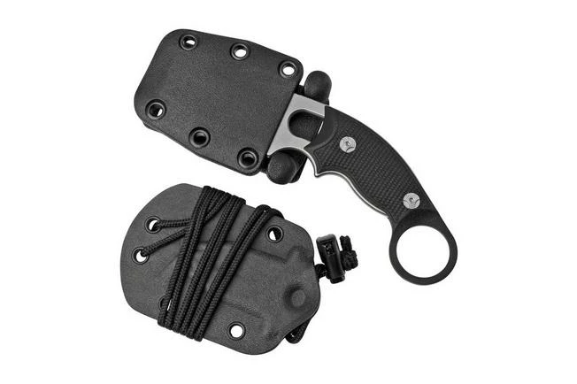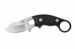 The Hogue EX-F03 is a lightweight neck knife, designed by knife maker Allen Elishewitz. The blade is made from 154CM steel and enhanced with a stonewashed finish. The end of the handle is enhanced with a lanyard eye with a piece of knotted rope. Because of the large cut-out in the handle the weight is low, great for a neck knife. It also enables you to wrap paracord around the handle. For a neck knife this knife is quite large. Where you sometimes see that the handle of a neck knife is difficult to handle with large hands, this handle offers enough grip. The blade, with its 5.5 cm cutting surface, is also comfortable to use.