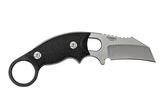 The Hogue EX-F03 is a lightweight neck knife, designed by knife maker Allen Elishewitz. The blade is made from 154CM steel and enhanced with a stonewashed finish. The end of the handle is enhanced with a lanyard eye with a piece of knotted rope. Because of the large cut-out in the handle the weight is low, great for a neck knife. It also enables you to wrap paracord around the handle. For a neck knife this knife is quite large. Where you sometimes see that the handle of a neck knife is difficult to handle with large hands, this handle offers enough grip. The blade, with its 5.5 cm cutting surface, is also comfortable to use.