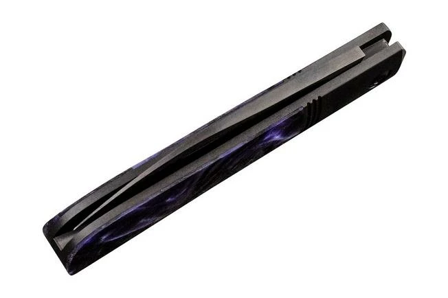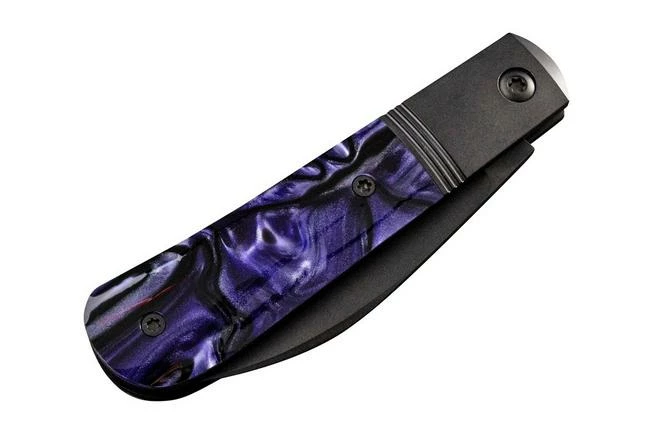The Jack Wolf Knives Laid Back Jack Kirinite Purple Wave is a modern interpretation of a traditional pocket knife. The pattern of this pocket knife is a ‘Swayback’. Which is what inspired the knife’s name. The Swayback is one of the most popular traditional pocket knife patterns. This pattern is known for its Wharncliffe blade shape and curved handle. This gives the Swayback pattern its elegant look.