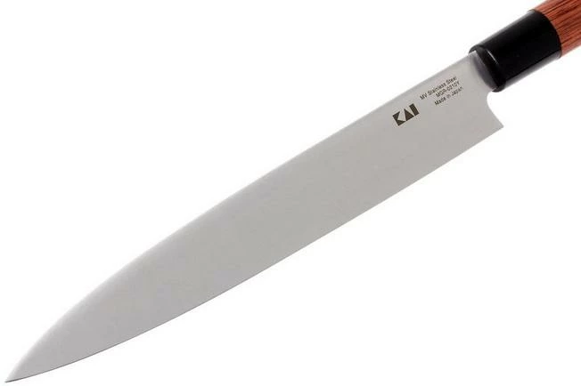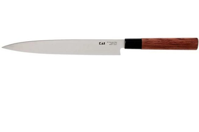 The Kai Seki Magoroku Redwood MGR-0210Y yanagiba is made according to traditional Japanese design. It was designed by and for cooking enthusiasts. The polished blade and wooden handle look remarkable. This knife is enhanced with the characterizing yanagiba blade shape with a large bevel on one side. Nevertheless, both sides are sharpened, including the right side of the blade. As such this knife is comfortable in use.