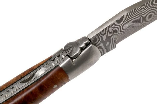 The Laguiole en Aubrac 12 cm Balbach damast, Thuya wood is a modern incarnation of the classic Laguiole knife. A thuya-wood handle in between steel bolsters. On the spine, you will find a stylized version of the Laguiole bee. The most striking is the blade itself. It is namely made from stainless Balbach damascus steel. This gives the knife a unique look and feel. Balbach damascus steel is forged in Germany by Markus Balbach.