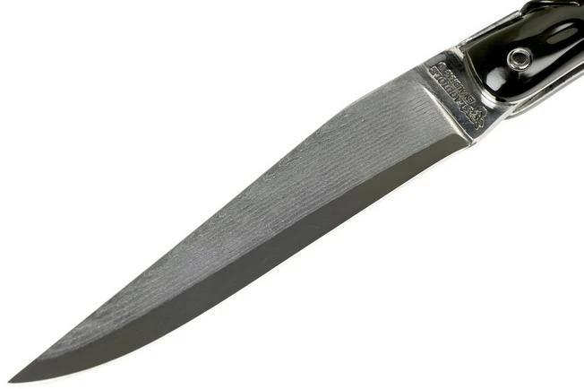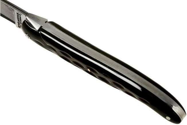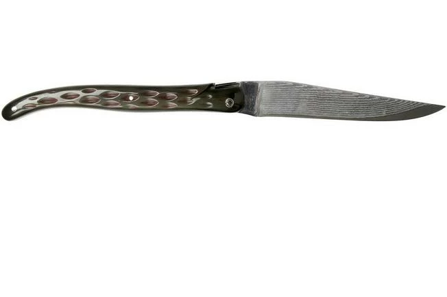 This Laguiole en Aubrac 12 Damascus pocket knife is a modern incarnation of the classic Laguiole knife. It has a buffalo horn handle that runs over the entire length, without a bolster. There is a stylised version of the Laguiole bee on the spine. The most striking feature is the blade itself. It is made of Japanese Damascus steel, which gives the knife a unique look. The different layers of Damascus steel contrast beautifully with the dark core of the steel.