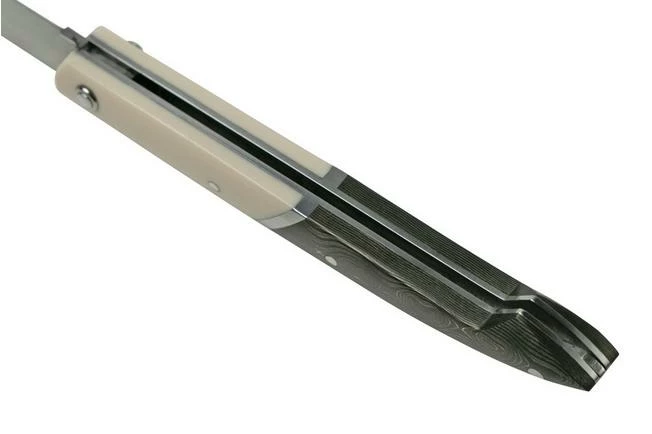 The Laguiole en Aubrac Capucin Elforyn Gold Carbon Fibre is a small French pocket knife with a classic design but modern materials. The knife has a handle made from white Elforyn and carbon fibre with gold plating. This pocket knife is handcrafted to guarantee a refined finish.