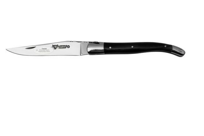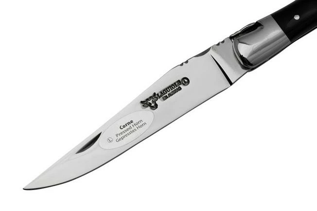 This Laguiole en Aubrac 12 cm pocket knife is a classic Laguiole knife. The handle is made from horn. The spine of the handle is decorated with stunning filework. The blade is made from stainless Sandvik 12C27MOD steel. Both the bolsters and the blade are polished. This makes the knife look extra chic.