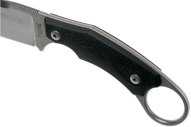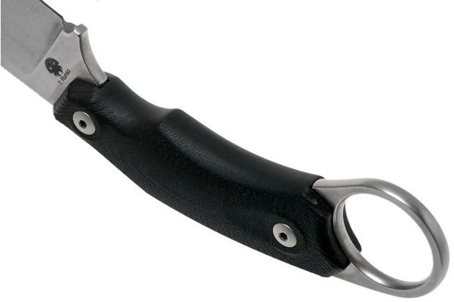 The Lionsteel H2 Drop Point is a fixed outdoor knife, designed by Tommaso Rumici. It is a robust fixed knife, and you can immediately see that part of the design is inspired by the Filipino karambit or kerambit. However, the Lionsteel H2 has a drop point blade, which is a lot more practical than the hawkbill (hook) you see on most karambits. You do have the handy ring at the end of the handle, though. This gives you a solid grip however you choose to hold it, and makes it harder to lose. Especially if you have your index finger or little finger through the ring.
