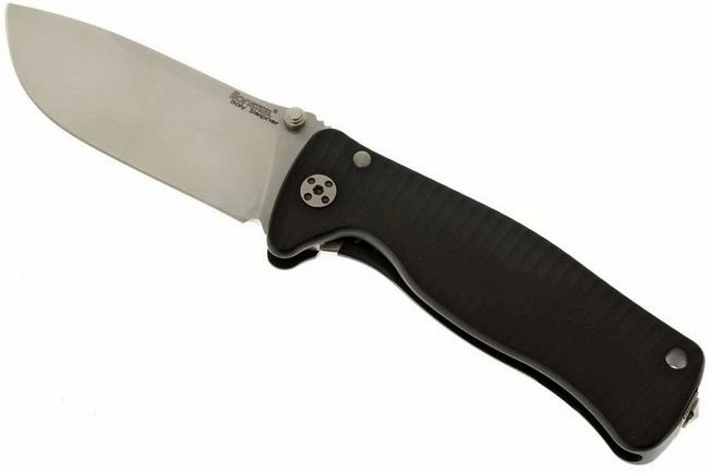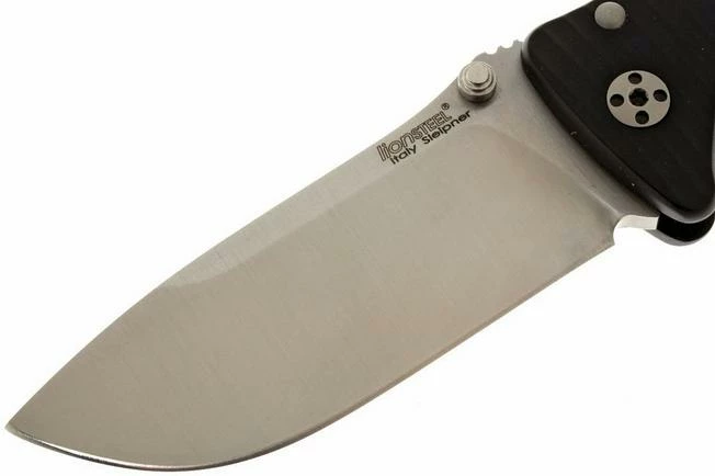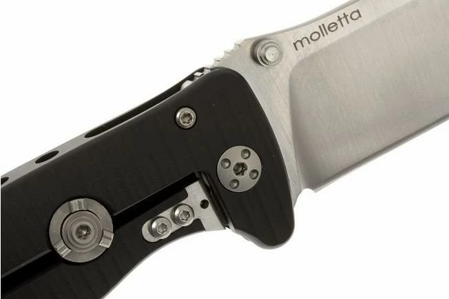 The SR2 is a smaller version of the Lionsteel SR1. This pocket knife looks a bit kinder, due to the smaller size.. Because the knife is pretty wide, it feels anything but small or puny in your hand. The handle is machined from a single piece of aluminum. The back of the handle is decorated with holes, which cause the weight of the knife to decrease siginificantly. The wide blade, which is made of Sleipner steel, can be easily opened with one hand. Because the thumb studs are placed on both sides of the blade, it can be used by both right- and left handed users. The top of the blade is marked with ridges that provide extra grip. A sturdy framelock blocks the blade. The end of the framelock is protected by a hardened steel element, which can be replaced if necessary.