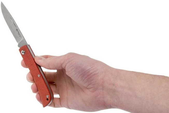 The Maserin Scout is a practical and compact EDC pocket knife. The first thing you notice is the stunning coloured micarta handle. Micarta is comprised of layers of canvas with epoxy which is compressed under high pressure. This leaves you with a very sturdy and beautiful handle material. Interesting about micarta is that it can become darker after use. It is the result of the oils in your hand that which form a sort of patina. Getting tired of this dark colour? Simply degrease it with some petrol and the micarta will be almost as good as new again.