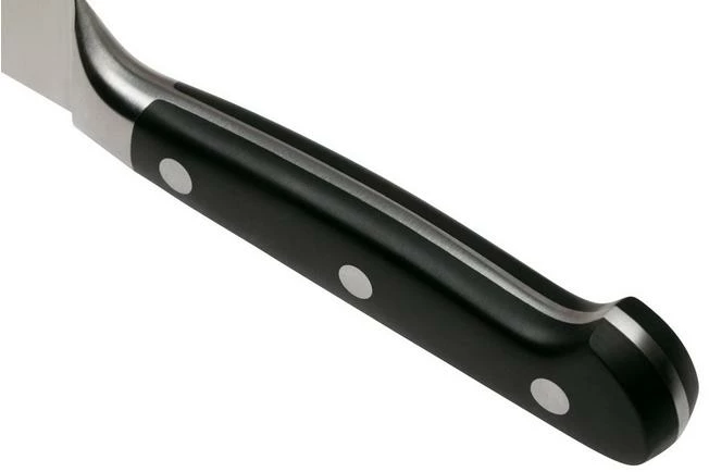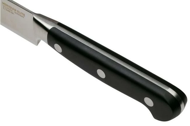 The Messermeister Meridian Elite carving knife is a long and razor-sharp kitchen knife. It’s ideal for cutting slices of meat or sushi. The long blade enables you to cut in long, smooth strokes. Because the blade is low and dimpled, slices won’t stick to the blade so easily. This means you can easily cut thin slices without tearing them. The sharp tip is perfect for small, delicate tasks such as removing tendons or fat from pieces of meat.