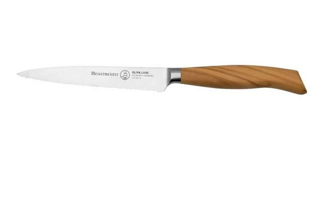 The Messermeister Oliva Luxe tomato knife is a serrated knife used for cutting through tomatoes effortlessly without squashing them. The fine serrations ‘bite into’ the tomato skin and cut through it smoothly. As well as tomatoes, this knife is also suitable for cutting other vegetables with a hard skin, small bread rolls and even hard cheeses.