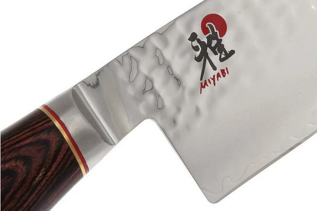 The Miyabi 6000MCT knives are the perfect symbiosis of ultimate functionality and unique aesthetics. The blade is made of ice-hardened Micro-Carbide Cryodur steel, folded between two layers of other steel. This steel is hand-hammered (Tsuchime), which gives the blade a gorgeous traditional look. The small dents on the blade make sure food does not stick to it. The 63HRC steel makes it a very hard blade. The blade is Honbazuke-sharpened and combined with the high hardness guarantees ultimate sharpness. The stabilised cocobolo-wood handle is ergonomically shaped and the mosaic pin completes this beautiful knife.