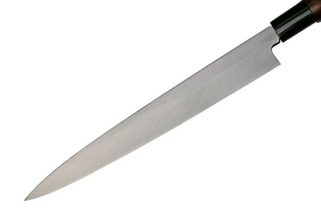 The Mujun S62-J yanagiba 24 cm is a long and stylish Japanese kitchen knife. With the long blade of a yanagiba you can cut wafer-thin, straight slices of meat and fish with one smooth movement. Perfect for cutting sashimi! This knife is sharpened on one side while the other side is hollowed out. This ensures that meat or fish does not stick and falls off the blade easily while you are cutting.