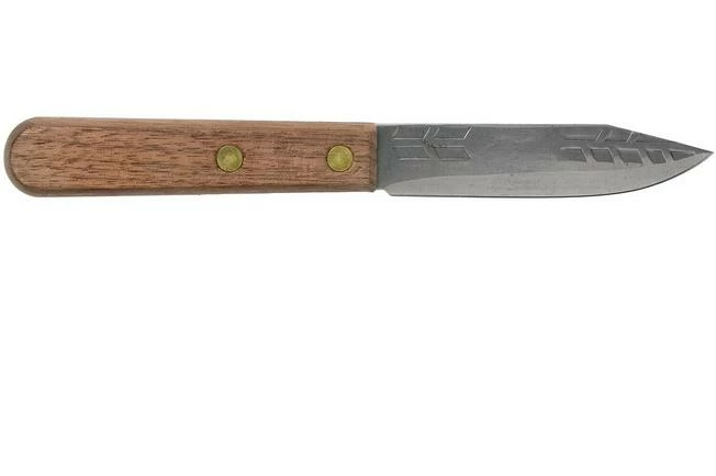 This Ontario Old Hickory paring knife is enhanced with an 8 cm blade. A modest knife with a blade shape that might remind you of a kiritsuke. Perfect for general purposes: cutting vegetables, meat and fish. The reversed tanto-profile of the kiritsuke makes the tip very agile for the finer cutting jobs, but also vulnerable. Please note: not suited to cut through bones.