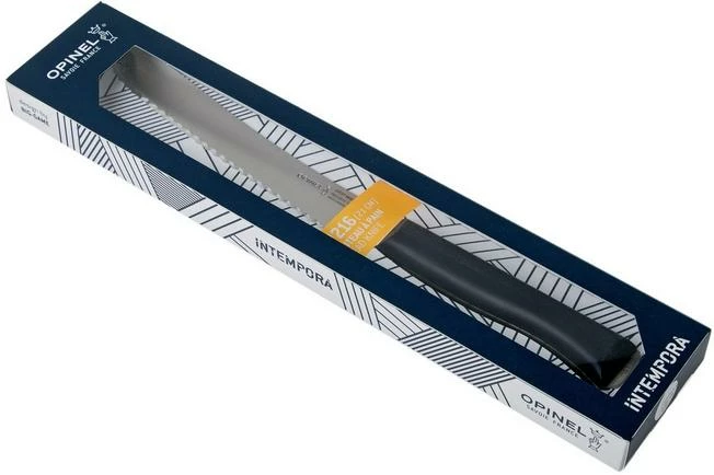 This Opinel Intempora bread knife no. 216 21 cm is a kitchen knife that, because of the shape of the handle, might remind you of the famous Opinel pocket knives. It is a decent knife you can work efficiently with. The stylish plastic handle makes the knife look very elegant.