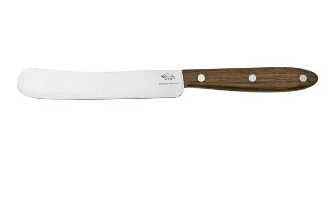 The Otter table knife smoked oak is perfect for spreading butter, jam and other tasty spreads on your sandwich. The rounded tip of the blade makes smooth and even spreading of sandwich spreads very easy. With a blade length of 12.5 cm, this knife is also perfect for scraping out empty jars. The knife is razor-sharp and therefore also suitable for cutting sausages, cheese and soft bread.