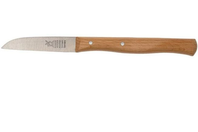 The Robert Herder red beech straight classic peeling knife follows in the footsteps of Robert Herder’s famous mill knives. This peeling knife is ideal for peeling fruit and vegetables. It can also be used for various other small cutting jobs. The pure stainless steel blade is sharpened by hand according to the traditional German “Solinger Dünnschliff” principle. The result is a razor-sharp knife. The handle is made from red beech wood, seamlessly attached to the blade with three rivets.