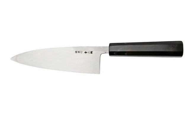 The Sakai Takayuki Blue 2 Steel Japanese Style 01237 deba 18 cm is a sturdy Japanese kitchen knife. The deba was originally designed for filleting and preparing meat and fish. The blade is thicker than an average kitchen knife, allowing you to cut through small bones, ligaments and tendons without damaging the knife’s edge. This knife is sharpened on one side, while the other side is hollowed out. This ensures that meat or fish does not stick and falls off the blade easily while you are cutting.
