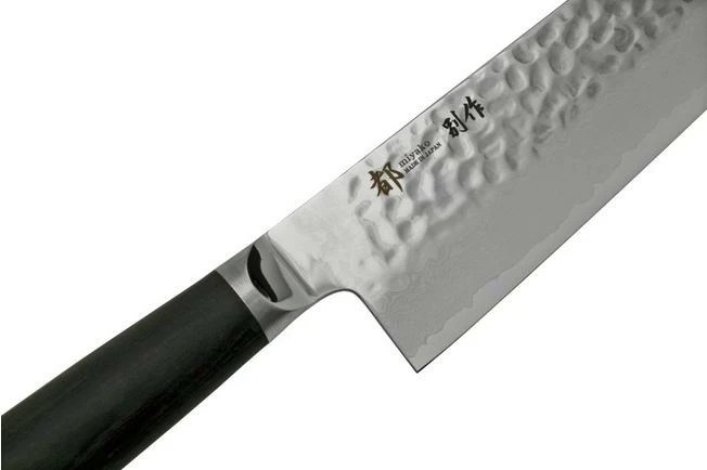 The Shizu Hamono Shikisai Miyako Bessaku gyuto 21 cm is a versatile Japanese kitchen knife. In Japanese, Gyuto means ‘cow sword’. Sounds gruesome, but it simply means that this knife was originally designed to prepare meat. Today, the gyuto knife is considered an all-round chef’s knife for cutting meat, fish and vegetables.