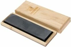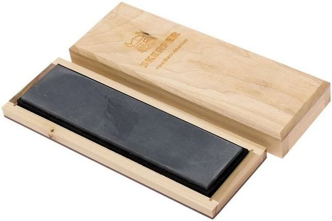 The Skerper Hard Black Arkansas bench stone is a fine stone equal to an American 2000-3000 grit stone. This stone will start the polishing process of the edge. The finish of this stone is rather fine and will get edges shaving sharp. Long and wide enough for all sharpening applications, from kitchen knives and outdoor knives to various woodworking tools and razors. These stones come in 5 different grits, for a stone progression from rough all the way to a very finely polished edge. Each stone comes in its own wooden box for storage and transport.