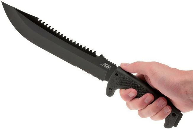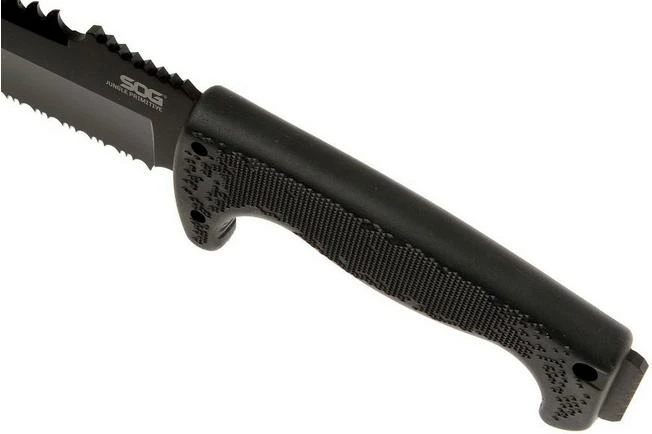 The SOG Jungle Primitive F03TN-CP is a large fixed knife that is halfway between a very large knife and a small machete. As you would expect, this knife is very strong, making it suitable not just for cutting, but also for chopping, prying, sawing and hammering. The Kraton handle provides a lot of grip. The razor-sharp stainless 8Cr13MoV steel is very easy to sharpen. There is a dark coating on the blade, giving it a tactical look. The top of the blade is partially serrated. Ideal for sawing. There is a piece of steel on the butt of the handle, which is handy for hammering. The supplied nylon sheath offers you a comfortable way to carry the knife. This all-round fixed knife is a must-have tool for your camping and survival trip!