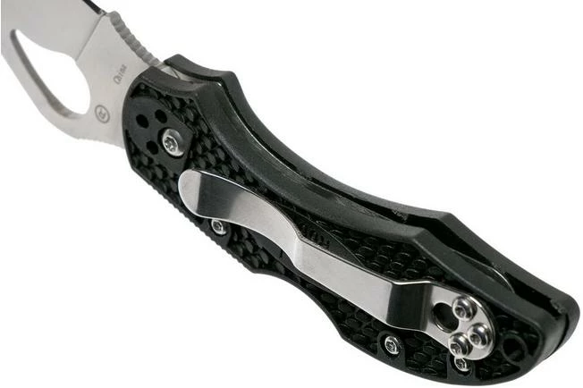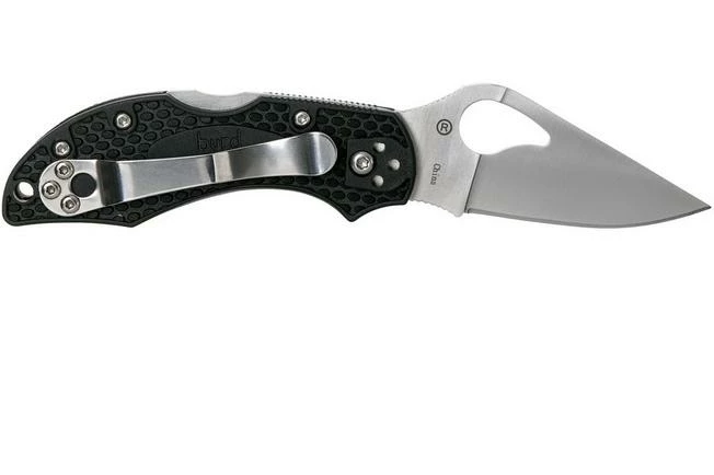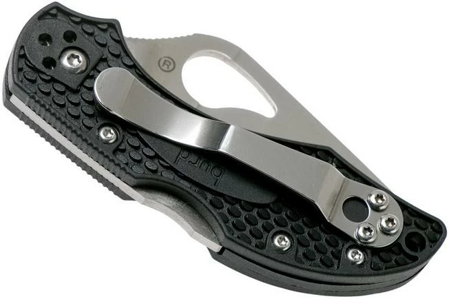 The Spyderco Byrd Robin 2 is a small but practical knife for daily use. The 8cr13MoV steel blade can easily be opened with the comet-shaped hole. When opened the blade is locked by a decent and reliable back-lock. As an extra safety precaution this back-lock has been enhanced with a so-called Boye-dent; a crescent-shaped cut-out that makes sure the knife won’t close during heavy-duty use.