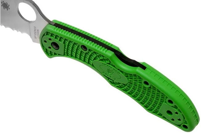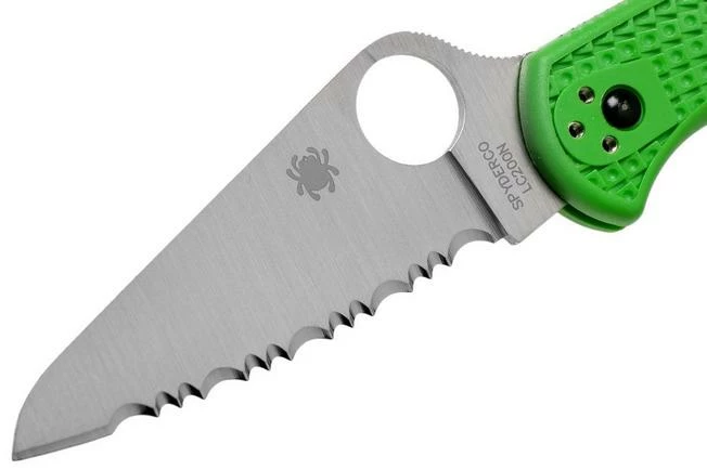 The Spyderco Salt 2 Green LC200N C88FSGR2 serrated is a practical pocket knife for everyone working in maritime surroundings or who loves spending time there. This version of the Spyderco Salt 2 has a blade made from LC200N steel. This is a remarkable stainless type of steel. Incredibly practical when you use the knife a lot around (salt) water. LC200N-steel is also easy to sharpen. This serrated blade is perfect when cutting through rugged materials such as rope and plastic. This version of the Salt 2 is enhanced with a green handle.