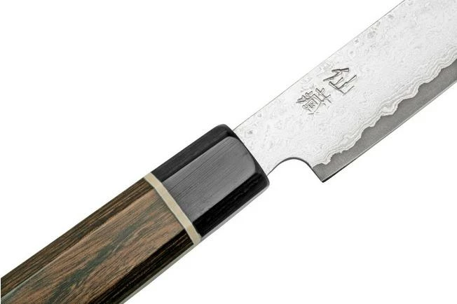 The Suncraft Senzo Black BD-02 utility knife 12 cm is a versatile kitchen knife. It is lightweight and perfect for small cutting tasks in the kitchen, like slicing pieces of tomato or cucumber.