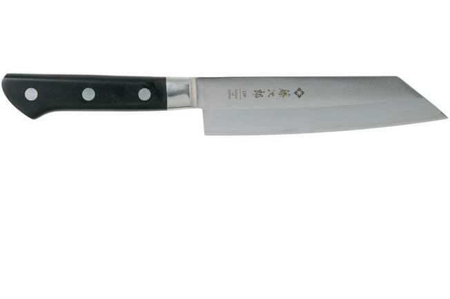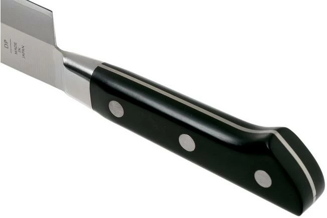 This Tojiro DP 3 bunka is enhanced with a kengata blade. This stands for ‘sword-like’ and refers to the suddenly sharply sloping end of the blade. Other than that the knife can be regarded as a member of the santoku family. With the narrow tip you can finely cut meat, fish and vegetables. Please note: not suited to cut through bones.