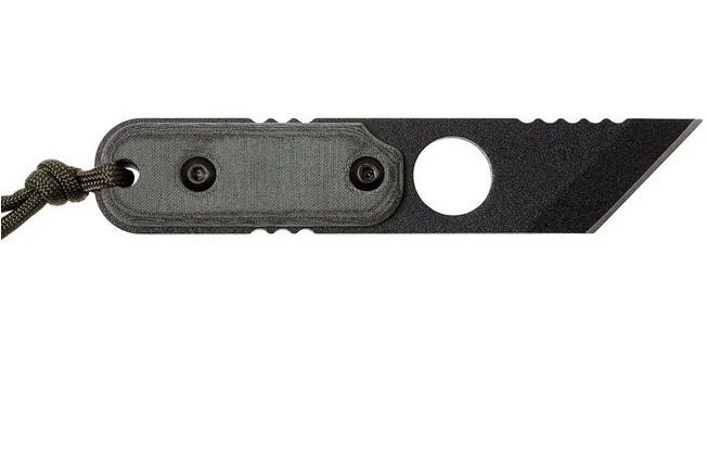 The TOPS ALRTXL-03 is a neck knife designed for emergencies. You could say that knives don’t get any simpler than this: a sheet of steel with a sharp edge and a micarta handle. However, if you look a little more closely, you’ll see that this knife has been well thought out. Grip serrations, also known as jimping, have been applied in all the right places. A hole has been drilled into the centre of the handle. Partly to save weight, but also so you can put a finger through it, giving you an excellent grip on this small knife.
