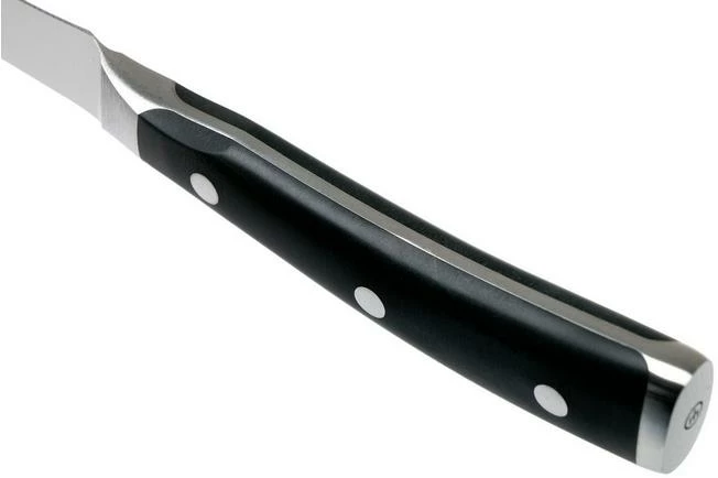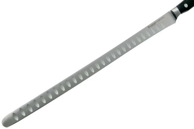 The Wüsthof Classic Ikon salmon knife 32 cm is truly the cream of the crop when it comes to top-quality salmon knives. The long blade ensures that you can cut thin slices of fish in one single movement. The low blade and the dimples ensure that the thin slices of salmon don’t tear because they stick to the blade.