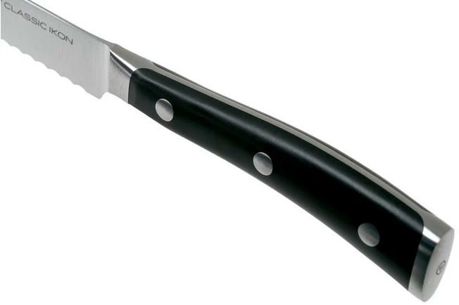 The Wüsthof Classic Ikon sausage knife 14 cm is, as the name might already suggest, perfect when cutting sausage. Because of the serrated blade you can easily cut through the hard outside of a sausage. This knife, however, is also great when cutting tomatoes, baguettes, melon or squash.