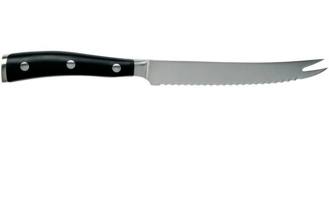 The Wüsthof Classic Ikon tomato knife, 14 cm is, as the name might already suggest, pefect when cutting tomatoes. Because of the serrated edge you can quickly cut through the tough skin of a tomato without crushing it. With the two tips at the end of the blade you can easily scoop up pieces of tomato, cucumber, cheese, salami or other food.