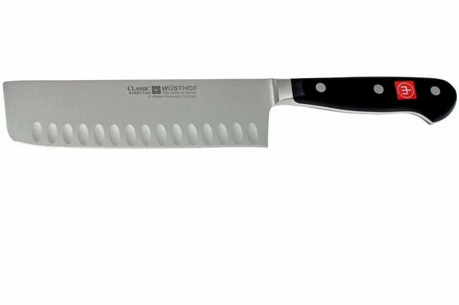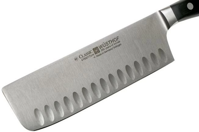The Wüsthof Classic Nakiri is a versatile Japanese paring knife. The Nakiri can slice, chop and wedge in an instant. You can easily cut thick and thin slices of fruit and vegetables. The dents in the keeps food from sticking to it.