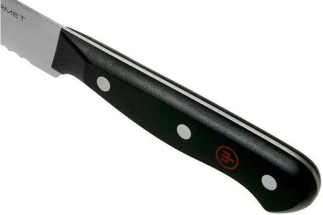 This Wüsthof Gourmet bread knife 20 cm is a classic that belongs in every kitchen. In addition to cutting bread you can also use this knife when cutting vegetables and fruit with a hard skin. The serrated edge of this knife works like the teeth of a saw, but is much finer. As such you don’t have to apply any pressure to cut through a loaf of bread and even hard crusts are a piece of cake.